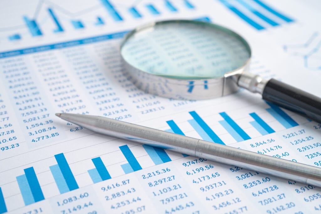 Magnifying glass on charts graphs paper. Financial development, Banking Account, Statistics, Investment Analytic research data economy, Stock exchange trading, Business office company meeting concept.